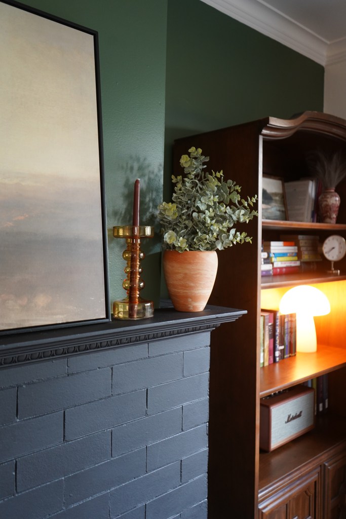I have it decorated simply because the fireplace is a statement in itself and I didnt want to distract from it by adding more bold statements with decor. I love the calm, neutral toned artwork I found on amazon. I think the lighter colors help balance the moodiness from the black brick and dark green wall color. I found the amber candlestick holders at a local vintage decor shop. The plumb colored candlesticks are from Hobby Lobby. They have a great color and shape selection for candlesticks. The two terracotta pots are from Goodwill. I was so excited when I found those for around $3 each! The terracotta color goes so nicely with the green on the walls and adds some warmth to the mantel. I picked up some faux eucalyptus leaves at a local home decor store/boutique.