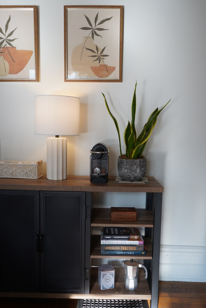 This side board is from amazon. I love the open shelves on the sides for displaying pretty things. I use the center shelves for storing coffee & tea related things. We got the wall art from Home Goods. I like how it ties in with the terracotta pots on the mantel. The lamp is from amazon. The base has a ribbed concrete finish which makes it feel very cool and elevated. The faux olive tree came from, you guessed it… amazon. It is made with a real wood branch as the base. The leaves aren’t glossy looking which makes it look more expensive. Olive trees can be so pricey but overall, I think this one looks very nice for the price.