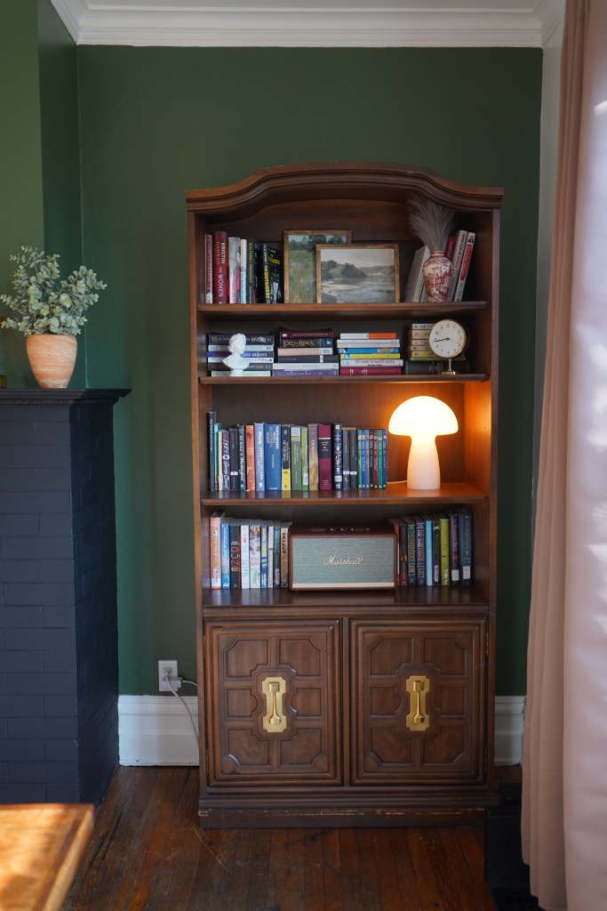 To the right of the fireplace is our bookcase. I love books and have a decent collection but it took us a while to find a bookcase we liked. It hurt my heart not having any of my books displayed for so long but we eventually found this real wood bookcase on facebook marketplace. My husband polished the tarnished brass hardware and got it looking new again.