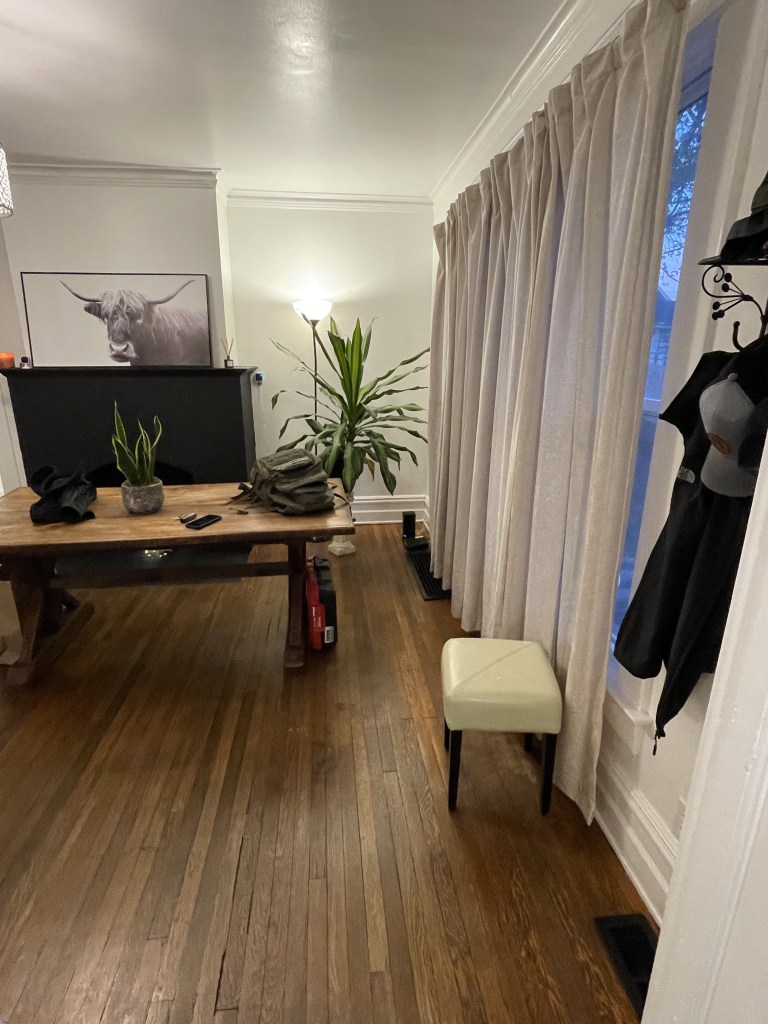 I found this small cushioned bench that was the perfect depth for the corner at TJ Maxx. It adds a little Scandinavian touch which I have hints of throughout the house. My husband uses this bench everyday when he puts his shoes on. We don’t have a coat closet so we use this shelf with hooks for hanging bags and coats. On the wall I have art from a talented Scandinavian illustrator I found on Instagram. It’s a picture of a husband and wife with their kids taking care of their garden and it makes me so happy whenever I look at it.